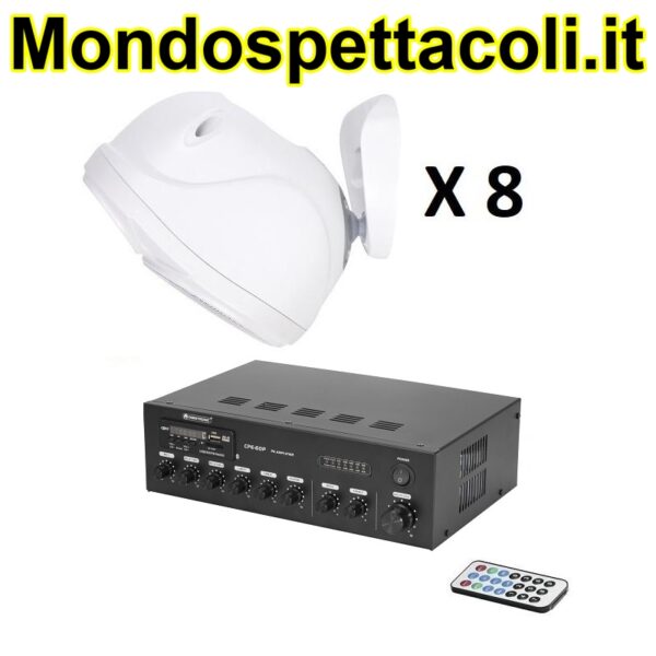 Impianto audio a 8 casse per diffusione di musica e parlato in ambienti da 100 a 200 mq