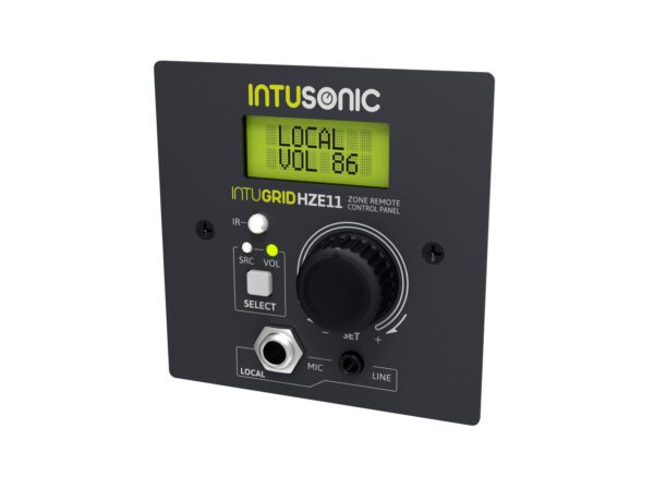 The INTUGRID HZE11+ comes with an improved design and provides a local control frontend for Intusonic’s RS-485 enabled audio control systems. It is the perfect complement for the HMA7x series of audio routers. It fits wall box sizes with minimal depth (86 mm) and hence can be mounted right where it is needed – in the room to be controlled. A standard CAT network cable is sufficient for connections; no additional power supply is required. Due to its daisy-chaining possibilities, more than one unit can be installed in a room, with the last operated one setting the system, and those settings being replicated on all HZE11+ panels as well as the connected main unit. A local audio feed is possible via the provided 3.5mm jack for a stereo signal or alternatively via a 6.35mm jack for a mono microphone. The last-selected external audio signal from an HZE11+ panel has priority over other panels in the room, so that their audio signals are ignored and there is no unwanted noise on the audio bus. The previous model did not have this feature. Both models are compatible, but when used in combination with the HZE11, the HZE11+ reverts to the previous functionality.For enhanced convenience, the HZE11+ also sports an infrared remote control receiver and comes with a IRB44 remote control right out of the box.