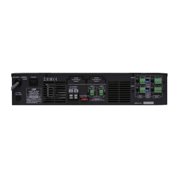 Amplificatore digitale 2 canalI 100V – Ingressi: Programma e Prioritario Alimentazione: 230Vac – 24Vdc – Dimensioni: 483x88x375 mm