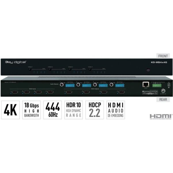 Key Digital KD-MS4X4G – Matrice HDMI 4×4 4K/18G – HDCP2.2 – HDR – EDID control Audio De-embedding analogico L/R bilanciato/sbilanciato e Digitale coassiale