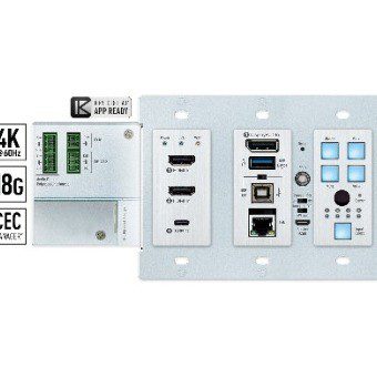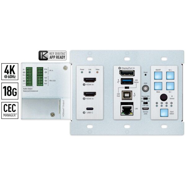 Key Digital KD-X4X1WUTX – Selettore 4×1 da pannello/parete con 2 HDMI, Display Port, USB-C, USB, LAN, Audio De-Embedder, 4K 18G