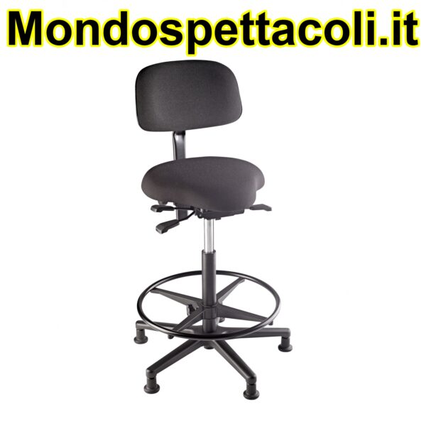 Fully adjustable bass chair with upholstered seat and backrest. Cushioning and fabric (Trevira CS) are made from inherently fire-resistant materials. The black fabric has a durability rating of 100,000 abrasion resistance cycles. The black powder-coated 5 leg base provides perfect stability. The footrest height adjustment is variable and the comfortable seat with leg recesses provides for additional comfort. The pneumatic seat height adjustment is variable using a release lever. The height of the backrest and the seat angle are also adjustable.