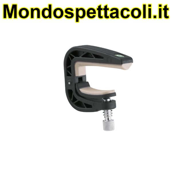 Capo in plastic for nearly all six and twelve string guitars with curved fingerboards. The capo is distinguished by its quick and uncomplicated ease of use. The clamping pressure is adjusted with a screw dial. There is no “string bend” due to linear clamping action, so tuning is not affected. No pre-setting necessary – simple and quick to mount on other frets.