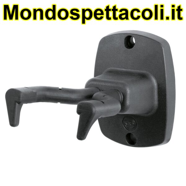 Screw-on type wall mount which accommodates a wide variety of guitar shapes. Features a patented flexible hooking-in and clamping system which quickly and firmly grasps the guitar neck. Studs at support arms provide extra protection. Support arms are covered with non-marring rubber to protect the instrument. Mounting plate made from high quality plastic material.