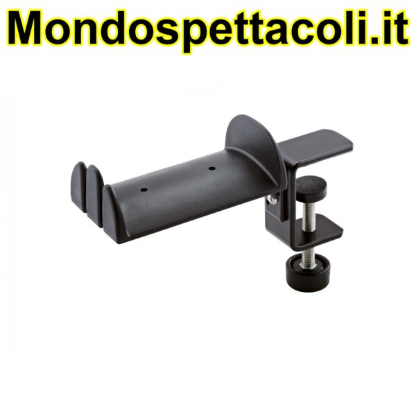Protective and stable holder covered in soft rubber for 2 standard headphones. In addition, there are grooves on the front of the support arm in which two in-ear-headphones can be hung. The clamp can be extended from 0 to 45 mm allowing it to be mounted on a wide variety of tables, shelves etc.