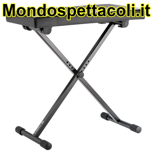 Comfortable keyboard bench with high quality black imitation leather or wear-resistant black fabric seat 540 x 300 mm, height-adjustable, wobble-free design, collapsible for easy transport.