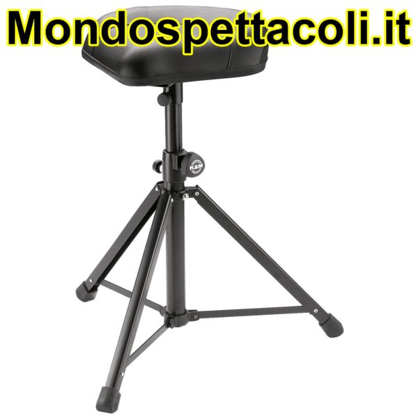 Multi-purpose stool, ideal for keyboardists, bassists, etc. Very sturdy tripod base. Wobble-free height adjustment mechanism, foldable. Large, comfortable seat covered with black imitation leather or wear-resistant black fabric.
