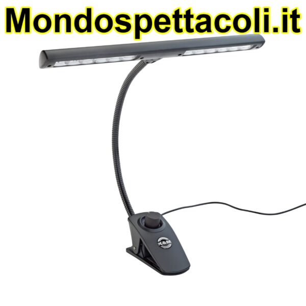 Perfect lighting for any situation. Equipped with 12 energy saving and durable LEDs guaranteeing optimal music desk lighting. The brightness is adjusted using a variable dimmer switch. The flexible goose neck ensures that the light is ideally positioned. A handy clip provides for easy attachment to all music desks with a thickness of 25 mm. A power supply with a 3 m cord is included.