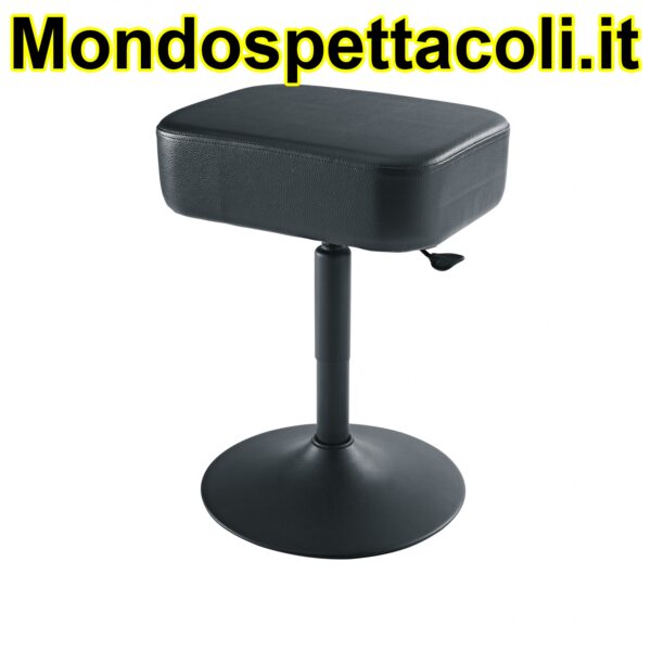 Perfect Position. You are always sitting in the right position with this comfortable piano stool. The rectangular seating area and heavy duty immitation leather cover with dimensions of 430 x 330 mm provide extraordinary seating comfort. The height adjustment is variable thanks to an integrated pneumatic spring. The lever is located under the seat and is easy to operate. The settings vary from 470 and 600 mm.