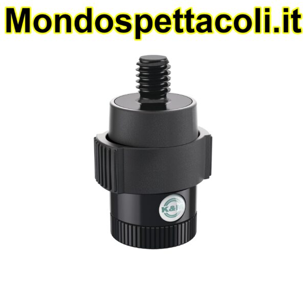 The Kànig & Meyer Quick Release Adapter makes quickly switching of microphones or other accessories on stage or in studio easier. The adapter consists of two components. The lower section is screwed into the 3/8″ or 5/8″ microphone stand thread, and the upper section is screwed on using a 3/8″ or 5/8″ microphone clamp or holder or to other accessories. The lower section ensures the secure and flexible hold of the upper section through 8 punched bore holes. The upper section is used to remove or click the microphone into place using the quick-release adapter. By pressing the scored plastic handle on the upper section both sections can either be disconnected or clicked in place. The adapter is made of high-quality aluminum. A thread adapter is included with the delivery for 5/8″ threading. Both adapter components can be left attached to the stand i.e. on the microphone/accessories.