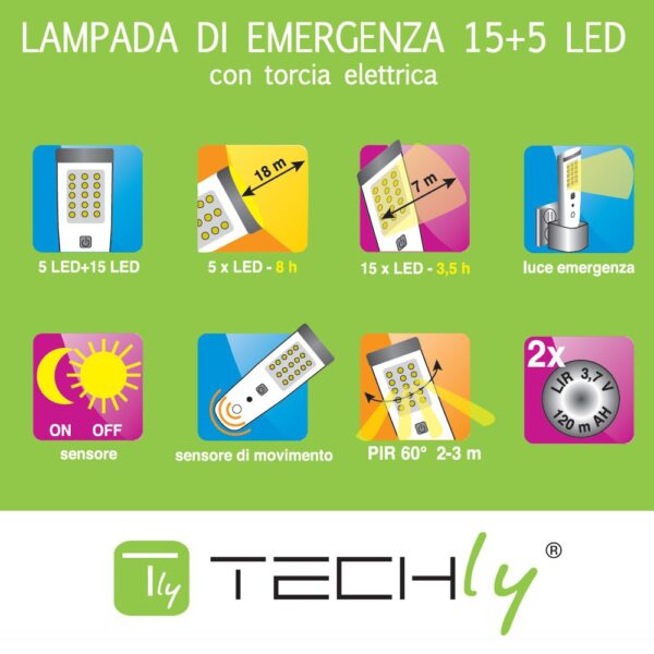 Questa splendida lampada Techly è un pratico dispositivo di illuminazione adatto in caso di temporanee interruzioni di corrente o in situazioni di emergenza. Dotata di 15 + 5 LED e batteria, la lampada Techly dispone di diverse funzioni, fungendo sia da lampada d’emergenza che luce notturna. E’ la compagna ideale nella cameretta dei bambini, nei corridoi o nelle cantine.Il sensore di movimento (PIR, fotodiodo) di cui è dotata, determina l’accensione della lampada a 15 LED per 15 secondi in caso di rilevazione di movimento all’interno di un ambiente buio. Per attivare questa funzione è necessario, dopo aver collegato la base alla presa di corrente, alloggiare la lampada nella culla con i 15 LED frontali accesi. I-LED EMGY15 può essere utilizzata anche come luce d’emergenza in caso di interruzione della corrente elettrica. Rimuovendola dalla base di ricarica, diventa una pratica torcia grazie ai 5 LED posizionati nella parte superiore, in grado di illuminare fino a 18 metri di distanza. L’interruttore ON/OFF permette di accedere alle diverse funzioni della lampada, attivando o disattivando alternativamente i 5 o 15 LED. La base di ricarica evita il fastidio di dover sostituire le batterie e rende questa lampada disponibile al momento del bisogno e sempre pronta all’uso. Si collega direttamente alla presa di corrente domestica da 230V. La lampada Techly è un oggetto indispensabile in ogni casa!Caratteristiche:• Lampada multifunzione: luce notturna con 15 LED combinata ad una luce di emergenza e una torcia con 5 LED• Luce notturna / di sicurezza dotata di accensione / spegnimento automatico grazie al sensore incorporato di movimento e crepuscolare• Dotata di base di ricarica, ricarica wireless tramite induzione elettromagnetica• Rimuovendola dalla base di ricarica diventa una pratica torcia a 5 LEDSpecifiche tecniche:• Autonomia minima: 15 LED >1ora, 5 LED >5ore• Tempo per ricarica completa: 8 ore• Batteria incorporata: 2450 ioni litio/3.7V/120mAh• Fonte di alimentazione: AC 220V/50Hz/0.015A• Sensibilità del sensore PIR di movimento: 2-3 metri• Sensibilità angolare del sensore PIR: 60°• Tipo LED: – φ 5 120° LED/1200-1300mcd/0.07W – φ 5 15° LED/15000-17000mcd/0.07W Dimensioni:• Altezza 178 mm• Larghezza 80 mm• Profondità 56 mm• Peso: 180 gCertificazioni:• CE• RoHS• RAEE