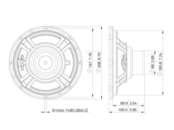 | Speaker: | Woofer 8" with neodymium magnet Basket material: steel Conematerial: weatherproof Cardboard/paper Voice coil lows 2" |