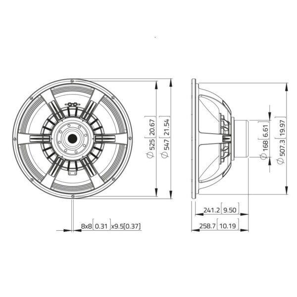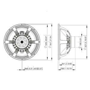 | Speaker: | Woofer (21″) approx. 53 cm with neodymium magnet Basket material: aluminum Voice coil lows (4.5″) approx. 11.5 cm |