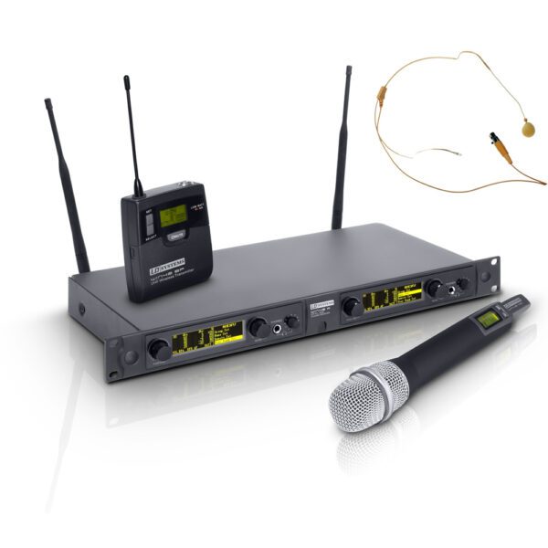 LD Systems WIN 42 HBHH 2 – Sistema per radiomicrofono con trasmettitore da cintura, cuffia con archetto color beige e microfono a mano dinamico