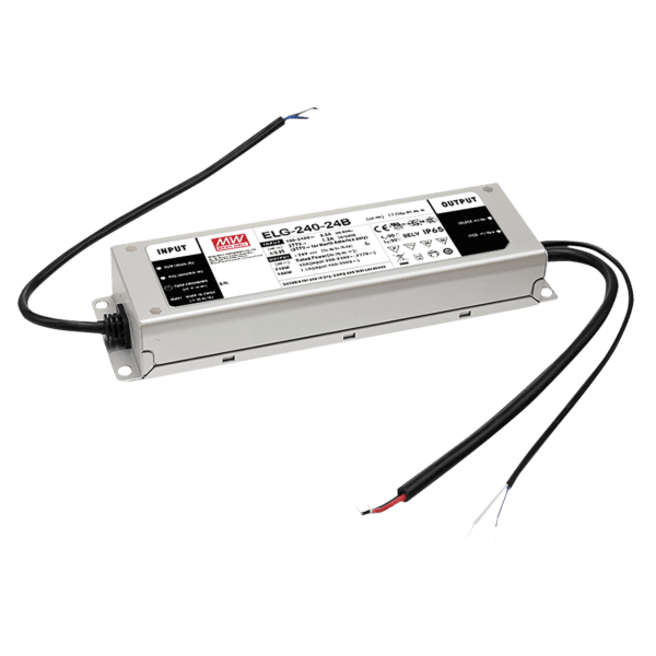 La serie ELG-240 è una gamma di driver da 240 W AC/DC dotati della doppia modalità tensione costante e uscita di corrente costante. I driver ELG-240 funzionano ad una potenza di 100~305 V AC a 24 V. Grazie all’elevata percentuale di efficienza fino al 93% e a un design senza ventole, l’intera gamma funziona ad una temperatura compresa tra -40 ºC ~ +90 ºC in condizioni di ventilazione naturale. Il design dell’alloggiamento in metallo e il grado di protezione ingresso IP67 rendono la serie adatta ad applicazioni sia in ambienti interni che esterni. Il driver ELG-240 è dotato di numerose opzioni funzionali, come i sistemi dimming, ed inoltre fornisce una flessibilità di design ottimale per i sistemi di illuminazione LED.