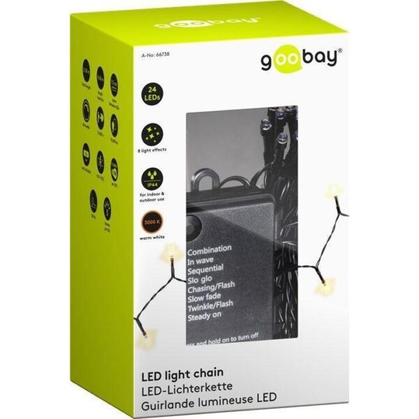 • Decorazione luce d’atmosfera per uso interno ed esterno• Catena leggera di colore nero con 24 LED bianco caldo• 8 diverse combinazioni di illuminazione: combinazione / ondulato / luce sequenziale / oscuramento alternato e lampeggiante / lampeggiante / lento sbiadimento / scintillio / luce continua• Adatte sia per uso interno che esterno (IP44)• Funzionamento a batteria (3 x AA, non in dotazione)• Lunghezza totale: ca. 2,30 m• LED distanziati di 7,5 cm l’uno dall’altroSpecifiche tecniche• Voltaggio 1,5V• Illuminazione a LED• Colore: bianco caldo• Assorbimento di potenza 0,04 W• Corrisponde a lampadina da 1 W• Dimmerabile• Flusso luminoso 5 lm• Indice di resa cromatica 80 Ra• Consumo energetico ponderato 0,04 kWh / 1.000 h• Tensione operativa 4,5V (DC)• Uscita, min. amperaggio 0,213 A• Classe di efficienza energetica A++• Classe di protezione IP44• Durata operativa 10.000 ore• Numero di cicli di commutazione 10.000 pezzi• Colore cavo: nero• Materiale: PVCCaratteristiche ambientali• Temperatura di esercizio da -30°C• Temperatura operativa fino a 45°CCertificazioni• CE• RAEEContenuto della confezione• Luci natalizie I-LED-CHAIN24F8• Manuale utente