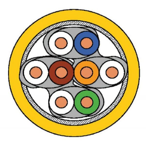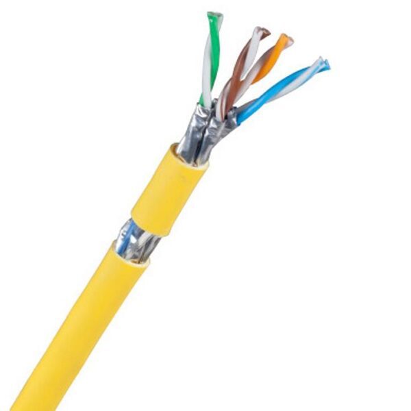 Caratteristiche:• S/FTP: Cavo a coppie intrecciate con treccia generale e schermo su ciascuna coppia• Cavo 4 coppie: 4 x 2 x AWG23/1 (RIGIDO ) diametro 0.56mm, rame • Conforme CPR (UE 305/2011) classe Cca – EN 50575:2014+A1:2016Specifiche:• Standard: Cat.7A 1200 Mhz• EN 50173; EN 50288-4-1• ISO/IEC 11801• IEC 61156-5• Temperatura operativa: -20 +60°C• Applicazioni: IEEE 802.5; IEEE 802.3: 10Base-T; 100Base-T; 1000Base-T; 10GBase-T; ISDN; TP-DDI; ATM• Cavo conforme CPR classe Cca – s1, d2, a1• Diametro esterno: 7,7 mm• In matassa da 100 m• Guaina LSHF (FRNC)• Colore: giallo