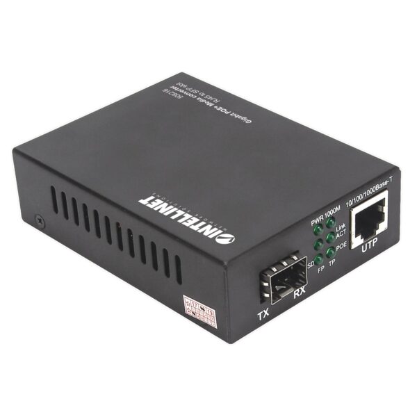 • Una porta RJ45 10/100/1000, massima distanza di 100 m• Una porta SFP per distanza fino a 120 km• Funzione Link Fault Pass Through (LFP) per semplificare la manutenzione della rete• Supporta periferiche PoE compatibili IEEE 802.3at e IEEE 802.3af (access point wireless, telefoni VoIP, IP Camera)• Supporta modalità full-duplex e half-duplex con autonegoziazione • LED di stato per alimentazione e Connessione/ trasmissione per entrambe le porte• Alloggiamento compatto in metallo IP30Standard• IEEE 802.3 / 802.3u / 802.3ab• 10/100/1000Base-T • IEEE 802.3at / 802.3af Power over Ethernet (PoE+) standard• EMC: FCC Part 15 Informazioni generali• Supporta: – 1000Base-T: Cat5 UTP/STP, max. 100 m – Slot per modulo SFP per modulo Mini GBIC (non incluso)• Connettori: – Una porta 10/100/1000 Mbps, full/half duplex, MDI/MDI-X – Una porta SFP • Piedinatura delle porte di uscita RJ45 (dati + alimentazione) – IEEE Alternativa A – Pin 1: [+] – Pin 2: [+] – Pin 3: [-] – Pin 4: inutilizzato – Pin 5: inutilizzato – Pin 6: [-] – Pin 7: inutilizzato – Pin 8: inutilizzatoLED• Alimentazione• LINK/ACT per porta RJ45• LINK/ACT per porta SFP • Indicatore PoE• LED di ingresso segnale otticoAlimentazione• Voltaggio in entrata: 56 V DC• Corrente in entrata: 0.5 AInformazioni fisiche• Chassis in metallo• Dimensioni: 95 (P) x 70 (L) x 25 (A) [mm]• Peso: 0.2 kg• Temperatura d’esercizio: 0° – 55°C• Umidità d’esercizio: 5 -80%RH, senza condensa • Temperatura di stoccaggio: -10 – 70°CContenuto della confezione• Media Converter Gigabit PoE+• Alimentatore esterno• Manuale d’uso