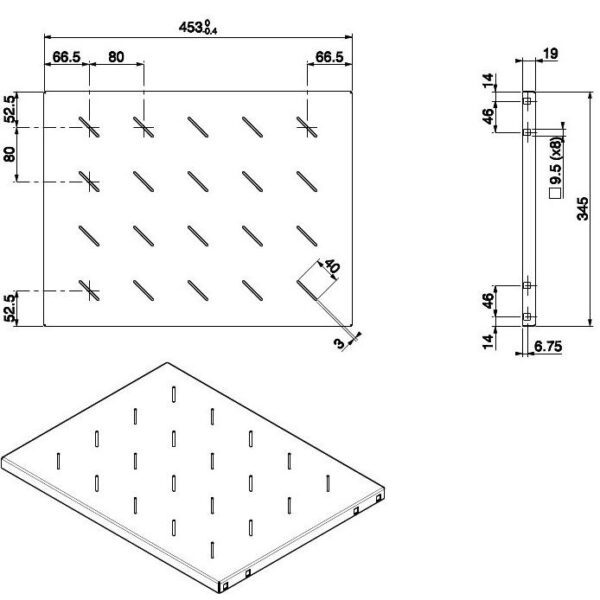 Mensola di appoggio per armadi, utile per la posa di apparecchiature non predisposte per l’attacco a Rack 19′.Indicata per armadi profondi 600 mm.Caratteristiche• Fissa• Profondità 345 mm • Portata fino a 50 Kg • Colore: Nero RAL9005• Fissaggio su 4 punti Verificare compatibilità con gli armadi tramite il configuratore rack
