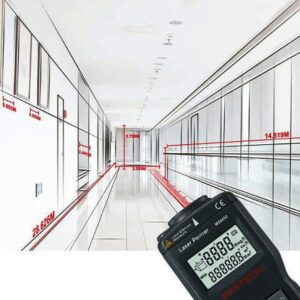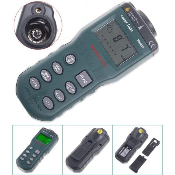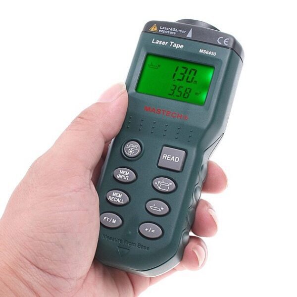 Misuratore di distanza ad ultrasuoni, indicato per effettuare velocemente e autonomamente misurazioni in luoghi interni (possibilmente in ambienti liberi da ostacoli ed arredamenti)Caratteristiche• Calcola area e volume ad ultrasuoni• Puntatore laser per individuare il punto esatto da cui si vuole misurare• Conversione automatica da piedi a metri• Retroilluminato • Portata di misura: da 0.6 a 15m (da 2 a 50 piedi) • Precisione: ±0.5%±1digit • Risoluzione: 0.01m(1piede) • Angolo di apertura: approssimativamente ±5 gradi• Tipo diodo laser :diodo laser rosso 650nm • Alimentazione: batteria 6F22 (9V) x 1 (inclusa)• Durata della batteria: 10 ore di misurazioni continue con batteria alcalina• Corrisponde al codice Mastech MS6450• Gamma di calcolo: – Lunghezza: 9999m- Area: 99999m2- Volume: 99999m3• Colore: verdeDimensioni• Larghezza 59 mm• Altezza 136 mm• Profondità 38 mm• Peso: circa 150g (batteria inclusa)Certificazioni• CE• RoHS