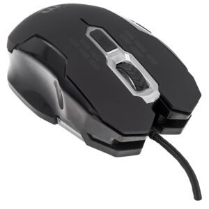 • Mouse gaming professionale con connessione USB• Sensore ottico preciso e struttura robusta per prestazioni affidabili• Forma ergonomica per un posizionamento della mano confortevole e un buon supporto del polso per ridurre la fatica anche in caso di uso prolungato• Base con ridotto attrito per un’ottima scorrevolezza su più superfici e il massimo controllo, sia per mirare un nemico che per allegare un foglio di calcolo• Pulsante superiore per il controllo immediato della risoluzione regolabile tra 800, 1200, 1600 e 2400 dpi, perfetto per il lavoro quotidiano o il gioco• LED che cambiano colore per evidenziare chiaramente il mouse in situazioni di scarsa illuminazione• Sei tasti facilmente raggiungibili per un controllo confortevole e senza limitazioni e ritardi• Cavo intrecciato extra-lungo con ferrite per rafforzare i collegamenti senza sacrificare precisione e prestazioni• Installazione Plug and Play – compatibile con Windows e MacCaratteristiche• Mouse: sensore ottico (R168B); risoluzioni 800/1200/1600/2400 dpi• Controlli: tasto destro e sinistro con rotella scroll (auto-scroll), pagina avanti, pagina indietro, regolazione risoluzione• LED• Materiale: plastica ABSCaratteristiche fisiche• Dimensioni mouse: 12.7 x 7.9 x 4.2 cm• Lunghezza cavo: 2 m• Peso: 61.5 gInformazioni generali• Temperatura d’esercizio: 0 – 45°C• Temperatura di stoccaggio: -15 – 60°C• Umidità d’esercizio: