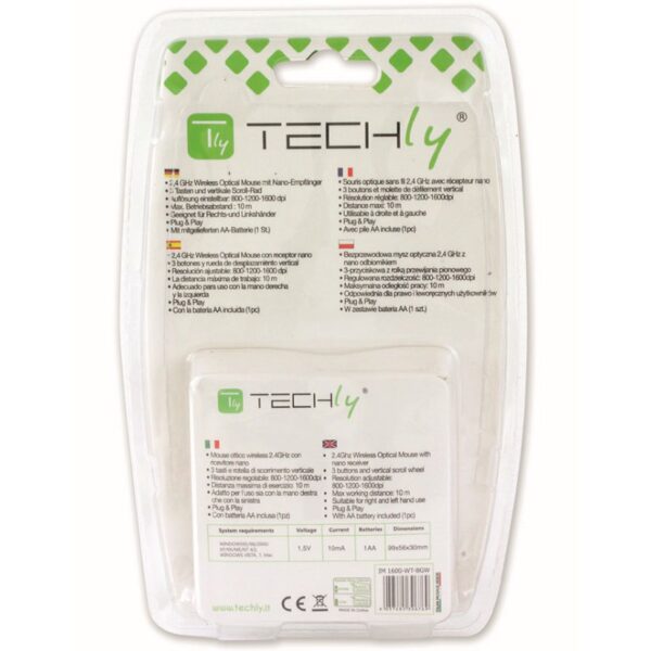 • Prestazioni ottiche di precisione in un design moderno e agile con micro ricevitore USB• Tecnologia wireless RF 2,4 GHz con una distanza operativa fino a 10 m• Grazie all’auto spegnimento è possibile mantenere adeguati livelli di carica della batteria• Regolazione della risoluzione a 800, 1200 e 1600 dpi• Adatto sia all’uso con mano destra che con mano sinistra• Installazione Plug and Play • Compatibile Windows e Mac• Include batteria Stilo AA• Colore mouse: bianco / azzurroCaratteristiche tecniche:• Voltaggio: 5V• Corrente: 100 mASistemi richiesti:• Windows 95/98/2000/XP/9X/ME/NT 4,0/Vista/7 e 8• Compatibile MacDimensioni:• Lunghezza: 99 mm• Larghezza: 56 mm• Altezza: 37 mmConfezione:• Confezione espositiva Techly