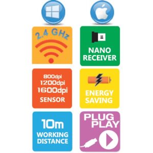 • Prestazioni ottiche di precisione in un design moderno e agile con micro ricevitore USB• Tecnologia wireless RF 2,4 GHz con una distanza operativa fino a 10 m• Grazie all’auto spegnimento è possibile mantenere adeguati livelli di carica della batteria• Regolazione della risoluzione a 800, 1200 e 1600 dpi• Adatto sia all’uso con mano destra che con mano sinistra• Installazione Plug and Play • Compatibile Windows e Mac• Include batteria Stilo AA• Colore mouse: bianco / rossoCaratteristiche tecniche:• Voltaggio: 5V• Corrente: 100 mASistemi richiesti:• Windows 95/98/2000/XP/9X/ME/NT 4,0/Vista/7 e 8• Compatibile MacDimensioni:• Lunghezza: 99 mm• Larghezza: 56 mm• Altezza: 37 mmCertificazioni• CE• RAEEConfezione:• Confezione espositiva Techly
