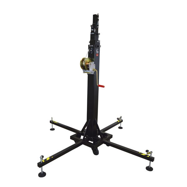 Questa torre di sollevamento telescopica con gambe rimovibili è perfetta per sollevare sistemi audio, luci e truss. Può sollevare carichi fino a 200 kg fino a un’altezza di 6,4 metri. Le funzioni di sicurezza includono una base rinforzata, un sistema di bloccaggio automatico delle gambe, perni di sicurezza e una bolla circolare che aiuta a livellare la torre per una stabilità ottimale.