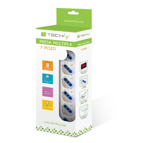 • Presa multipla a 7 uscite per spine italiane e schuko• Prese 10/16A bipasso/Schuko angolate a 45°• Include messa a terra per ogni presa• Include interruttore luminoso di accensione• Con occhielli di fissaggio• Voltaggio: 250V • Massima potenza prelevabile: 2500W• Cavo H05VV-F 3G1.0mm2, lunghezza 5m• Ciabatta elettrica con spina dritta 16A 2P+T• Colore multipresa: biancoDimensioni• Lunghezza: 36,5 cm• Larghezza: 5,5 cm• Altezza: 4,5 cmCertificazioni• CE• RoHS• RAEEContenuto della confezione• Multipresa 7 posizioni 10/16A