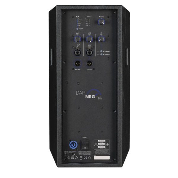 Il DAP NRG-8A è un altoparlante a gamma completa attivo con una potenza di picco di 360 watt (RMS continuo di 180 watt). Utilizza un woofer da 8” e un driver di compressione da 1”, ed è dotato di DSP interno con 4 utili modalità: Contour, Flat, Speech e +Sub, che applicano rispettivamente una curva di rumorosità, una curva piatta, una curva passa-alto o un passa-alto con frequenza ottimizzata e curva di fase specifica rispettivamente per la gamma di subwoofer NRG. Il driver di compressione è accoppiato a una tromba girevole con direttività di 90°x60°. L’amplificatore di classe D interno è dotato di un alimentatore a modalità commutata per ridurre il peso e aumentare il livello di efficienza. Il DSP interno include un crossover per il woofer e il driver di compressione, un limitatore a 2 bande, una protezione da cortocircuito e protezione termica.