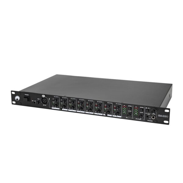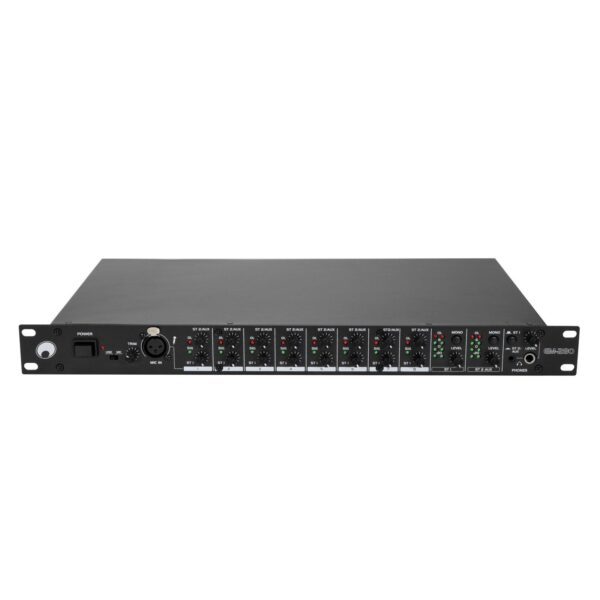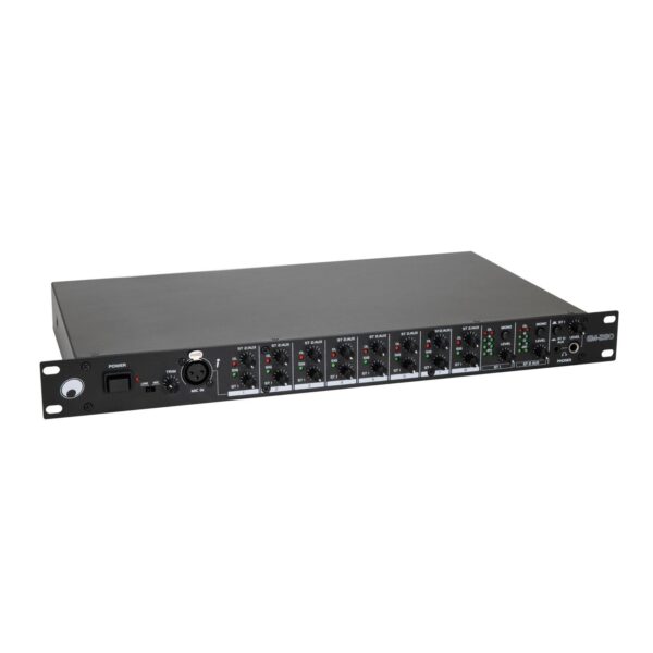 8-channel stereo mixer with 2 adjustable zone outputs, 19″