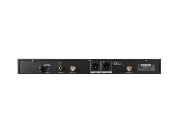 | Connections: | Input: antenna via 2 x BNC (F) Output: microphone via 2 x 3-pin XLR (M) mounting version Output: microphone via 1 x 6.3 mm plug (unbal.) |