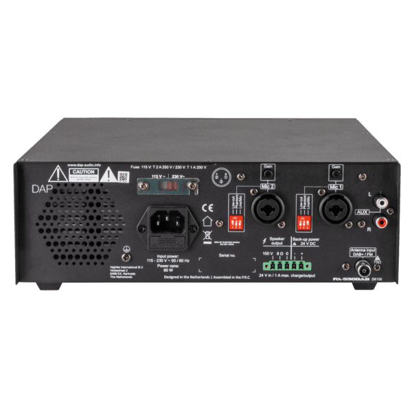 Il DAP PA-530DAB è un amplificatore di mixaggio mono compatto da 30 watt 100 V/8Ω con 4 sorgenti selezionabili e 2 ingressi microfono. Entrambi gli ingressi microfono sono dotati di alimentazione phantom e possono essere utilizzati anche come ingressi di linea. Un filtro vocale integrato può essere utilizzato per migliorare l’intelligibilità.