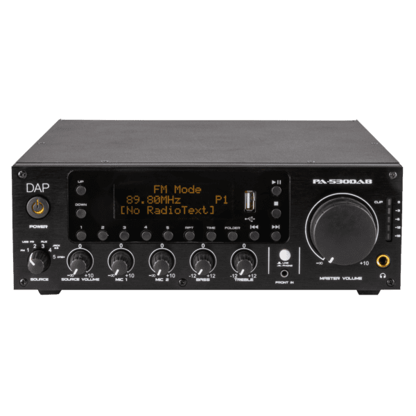 Il PA-530DAB ha un ingresso di linea sul retro e un ingresso Mini-Jack facilmente accessibile sul davanti per il collegamento di lettori MP3 o dispositivi mobili. Dispone inoltre di un lettore audio USB integrato e di un sintonizzatore FM/DAB+ con un ampio schermo LCD che visualizza la sorgente attiva, le informazioni sul sintonizzatore e i tag ID3. Il sintonizzatore FM/DAB+ integrato può memorizzare fino a 10 stazioni preimpostate.