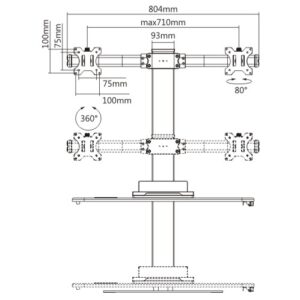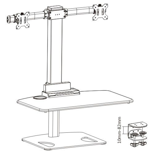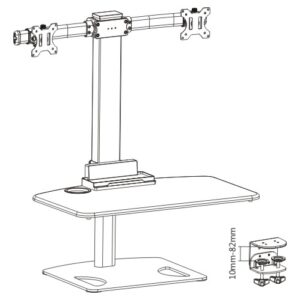 • Questa standing desk trasforma una qualsiasi superficie in una postazione di lavoro personalizzata, in grado anche di apportare durevoli benefici alla salute, contrastando gli effetti negativi provocati dalla sedentarietà del lavoro d’ufficio• L’altezza del piano tastiera si può facilmente regolare per ottenere un comfort ergonomico insuperabile• I supporti per i monitor sono completamente regolabili sia in altezza, che inclinazione e rotazione, permettendo di ottenere un angolo di visualizzazione ottimale a seconda delle diverse esigenze Caratteristiche• Con sistema di sgancio rapido della placca VESA e possibilità di scivolamento del monitor lungo il braccio• Regolazione di ogni singola placca VESA per un allineamento perfetto dei monitor• L’aggiustamento dell’altezza sul palo verticale promuove una posizione ergonomica e il passaggio da una posizione seduta ad eretta durante la routine lavorativa permette di contrastare gli effetti negativi dello stile lavorativo sedentario• Spazi predisposti per appoggiare e tenere sotto mano accessori e piccoli oggetti, in modo da mantenere l’area di lavoro ordinata• Una scanalatura permette di trattenere tablet e telefoni in modo da averli a portata di mano• Un’ulteriore scanalatura permette di appoggiare in modo sicuro la vostra tazza • Il sistema di gestione integrato dei cavi consente di mantenere lo spazio di lavoro sempre ordinato e sgombro da cavi vaganti • Incluso nella fornitura un morsetto per fissare il supporto alla scrivania, per far fronte a diverse esigenze di installazione Specifiche• Materiale: Acciaio, plastica, legno• Finitura superficie: verniciatura a polvere• Dimensione prodotto: 804 x 635 x 1120 mm• Installazione: con morsetto, con appoggio sulla scrivania• Dimensione dello schermo suggerita: 13′-30’• Numero degli schermi supportati: 2• Carico supportato: 2 x 6 kg• VESA: 100×100; 75×75• Inclinazione: +/-45°• Orientamento orizzontale: +/-40°• Rotazione:+/-180°• Braccio estensibile: no• Altezza: 660 mm – 1120 mm• Spessore del morsetto: 10 mm – 82 mm• Gestione dei cavi: si• Colore: Nero