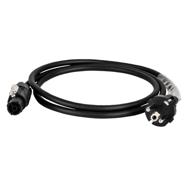 FPR03 è un cavo di alimentazione lungo 1,5 metri con un nucleo di 3x 1,5 mm². Ha un connettore Schuko maschio diritto su un’estremità e un connettore REAN PowerX Power Pro True femmina bloccabile sull’altra.