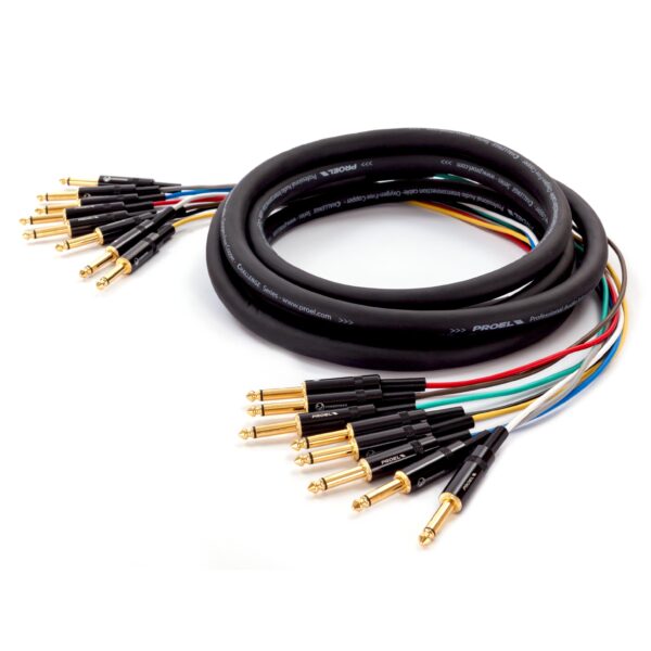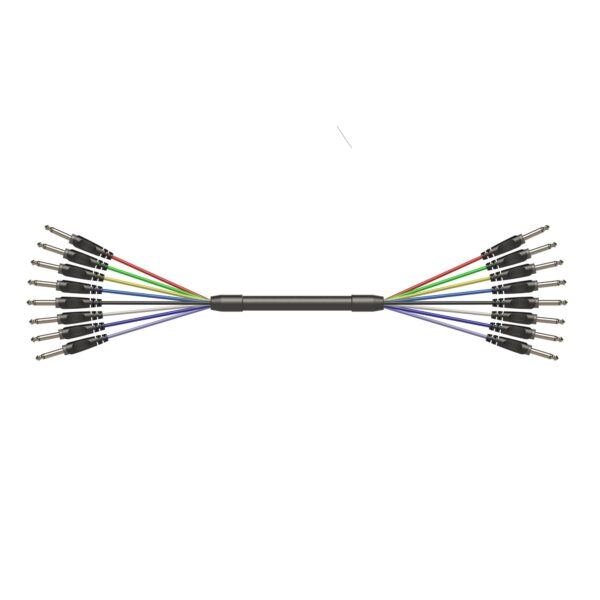 Cavo professionale multipolare analogico per studi di registrazione con connessioni in metallo YONGSHENG / 8 x jack mono Ø 6.3 mm – 8 x jack mono Ø 6.3 mm, di colore nero e contatti dorati. Lunghezza 4 metri. Colore disponibile nero