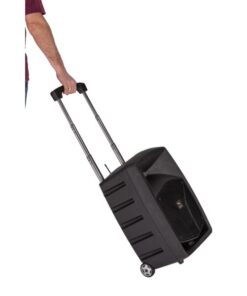 - Compact and light-weight PP cabinet for maximum portability, with two wheels and one retractable handle, adapter for standard speaker stand