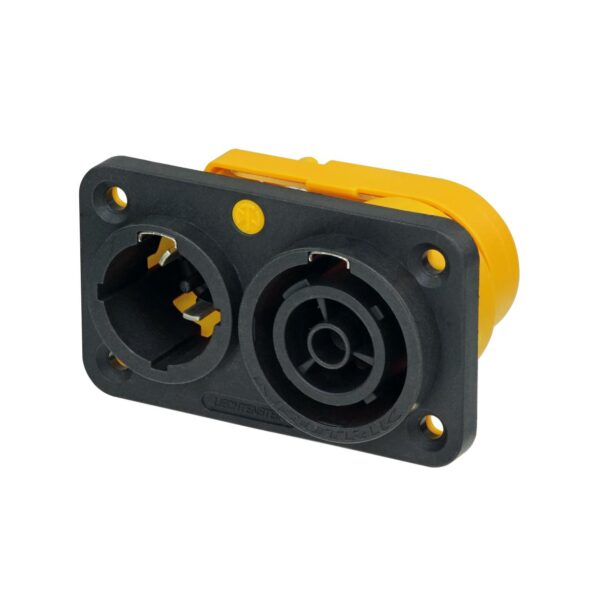 Connettore combinato – spina/presa – da pannello NEUTRIK “powerCON TRUE1” di potenza 20A con contatti terminali piatti da 1/4 “. Grado di protezione IP65 quando connesso. Colore giallo / nero, “power-in / power-out” system, 3 poli.
