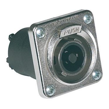 Presa da pannello Neutrik ‘SPEAKON’ con flangia quadrata a tenuta d’aria e tasto di PUSH, corpo interamente in metallo per applicazioni estreme, impermeabile e resistente alle peggiori condizioni climatiche, 50A, 4 poli.