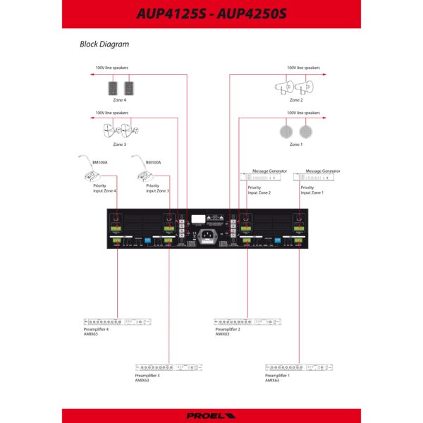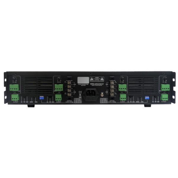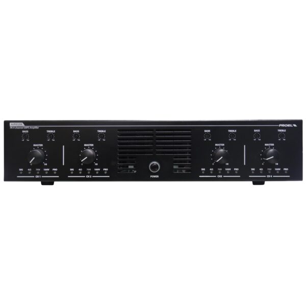 Grazie all’impiego di un alimentatore switching in tecnologia SMPS (switch mode power supply) e alla realizzazione del 70/100V elettronicamente senza trasformatori, è stato possibile inserire in un singolo cabinet ben 4 finali di potenza completamente indipendenti, riuscendo a contenere sia i pesi che gli ingombri.