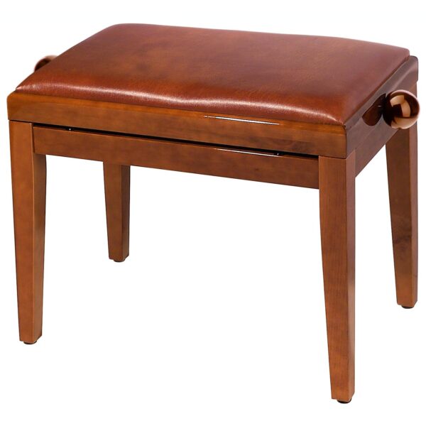 PANCHE REGOLABILI SERIE PB85;- Panchetta professionale regolabile in legno per piano ed organo, seduta imbottita con rivestimento in similpelle, meccanica in acciaio zincato e verniciato nero, comode manopole per la regolazione dell’altezza. Telaio Noce lucido. Cuscino con rivestimento in similpelle marrone.