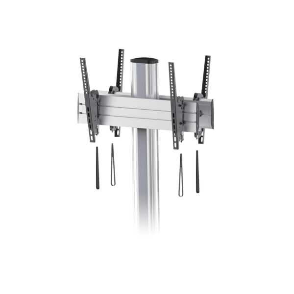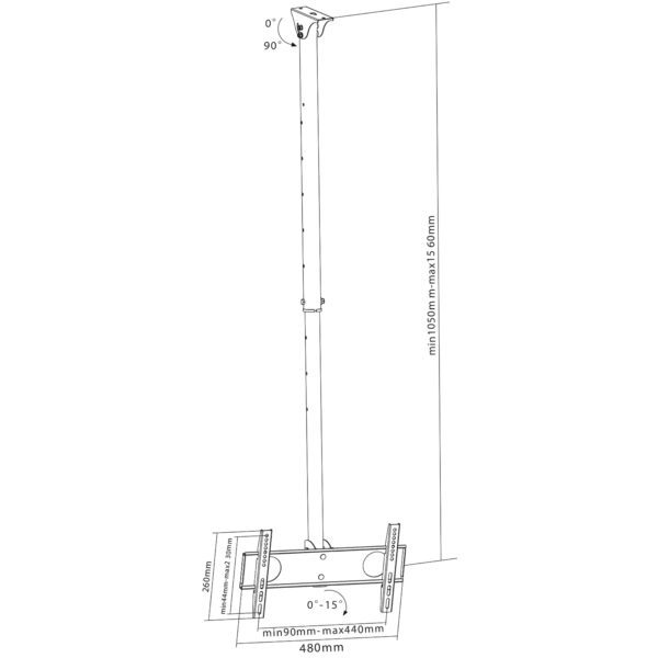 Supporto professionale universale per LED, LCD o TV a schermo piatto per montaggio a soffitto, (anche con superficie inclinata). E ‘la soluzione perfetta per le applicazioni retail e commerciali. Regolabile in altezza, da un minimo di 1050 ad un massimo di 1560 mm in altezza per offrire massima versatilità e compatibilità d’uso. Offre un’inclinazione di 15°. Può essere utilizzato per pannelli con un range da 32” a 55” (VESA 400 x 200 max) con un peso massimo di 50 kg. Dotato di un pratico sistema per l’organizzazione dei cavi per offrire un aspetto elegante ed ordinato. Colore nero.