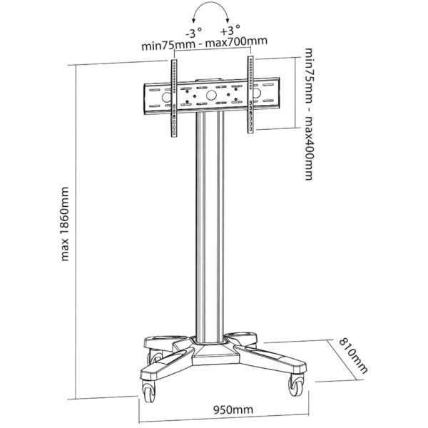 Supporto mobile per uso professionale,, realizzato in acciaio e alluminio, che può sostenere LED, LCD o TV a schermo piatto fino ad 80 kg di peso e con un range da 37” a 70” ( VESA 600×400 max). Il supporto per la TV si regola facilmente con le manopole laterali e più essere posizionato fino ad un massimo di 1860 mm per garantire una perfetta visualizzazione in ogni condizione di utilizzo. Provvisto di una solida base in acciaio dotata di robuste ruote con freno, per una tenuta ottimale del peso delle attrezzature ed una altrettanto facile manovrabilità. Dotato di pratici collarini per l’organizzazione dei cavi. Rappresenta una soluzione ideale per l’utilizzo in conferenze, esposizioni ed altre presentazioni professionali.