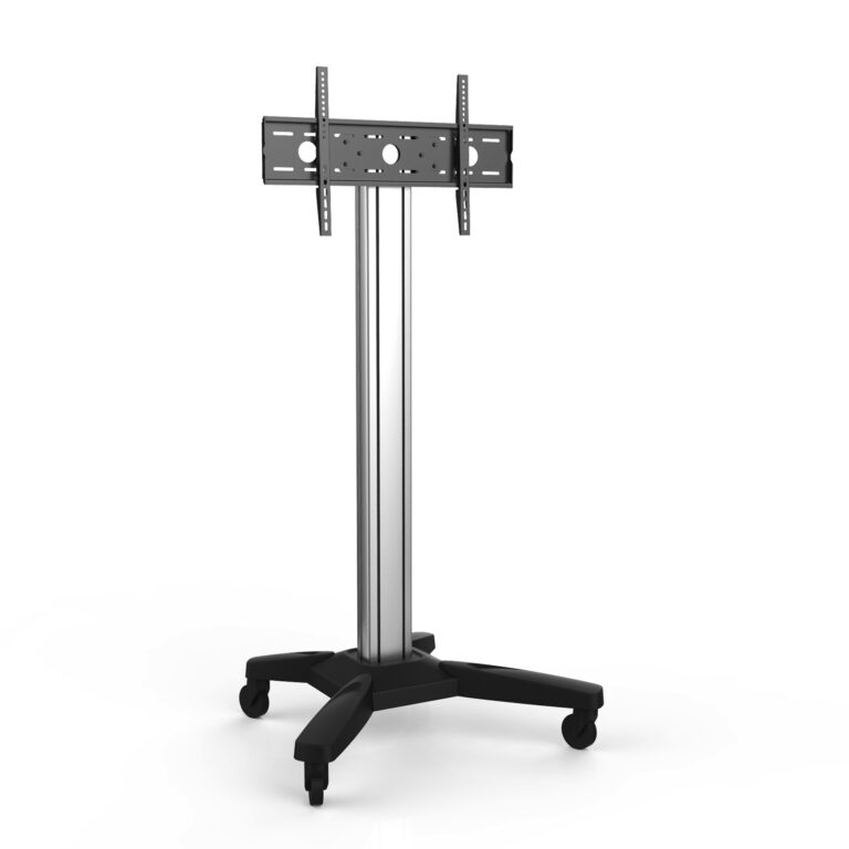 Supporto mobile per uso professionale,, realizzato in acciaio e alluminio, che può sostenere LED, LCD o TV a schermo piatto fino ad 80 kg di peso e con un range da 37” a 70” ( VESA 600×400 max)