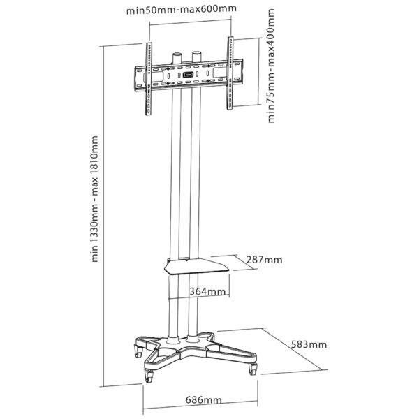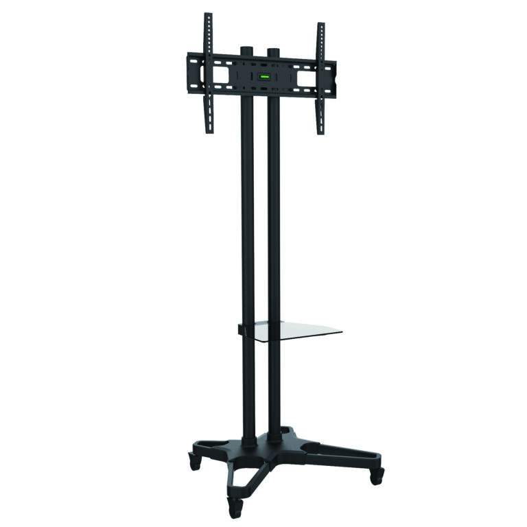 Supporto multifunzione per LED, LCD o TV a schermo piatto fino a 70 kg di peso e con un range da VESA 200×200 fino a VESA 600×400. Realizzato in acciaio verniciato nero e particolari in alluminio. L’altezza superiore del supporto per TV va da un minimo di 1330, fino ad un massimo di 1810 mm con cinque regolazioni intermedie, per le diverse esigenze di proiezione. Particolarmente adatto per imprese, scuole ed altre organizzazioni pubbliche. Dotato di una pratica mensola in vetro regolabile in altezza per il posizionamento degli accessori e di ruote pivottanti (due con freno).