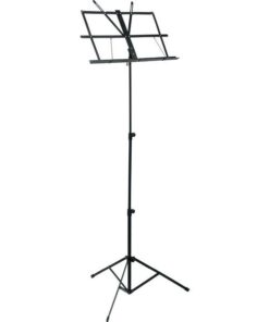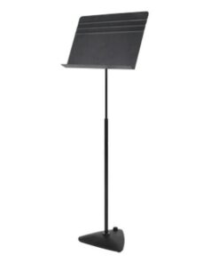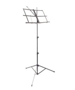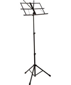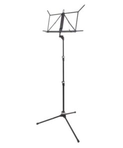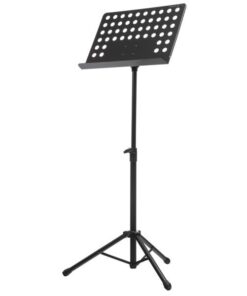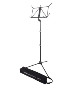 Leggìo professionale in acciaio tubolare. Altezza regolabile. Fornito di poggia spartiti in metallo forato, estremità antigraffio e piedini in gomma. Disponibile in finitura nero opaco con pratica borsa di trasporto in nylon inclusa.