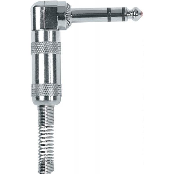 Jack stereo Ø 6.3 mm. -1/4′ angolare a 90°, punta in rame, manicotto in ottone nichelato argentato e molla passacavo flessibile Ø 7.3 mm.