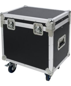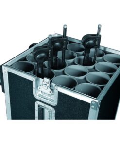 Custodia Professionale per aste microfoniche realizzata in multistrato di pino marino a 5 strati ad incollaggio fenolico, di spessore 9 mm. Rivestimento in laminato plastico NERO antigraffio. Internamente è provvista di tubi protettivi singoli in PVC per contenere 16 aste microfoniche. Dotata di chiusure a farfalla grandi ad incasso in acciaio zincato, maniglie ad incasso in acciaio zincato con impugnatura in gomma nera e ritorno a molla, angolari e rinforzi in acciaio zincato, profili in alluminio anodizzato e piedini industriali in gomma. Provvista di ruote da 100 mm industriali di colore blue (2 con freno).