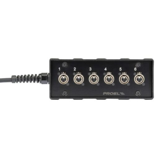 Audio box in materiale plastico antiurto cablato con 6 prese pannello XLR 3P NEUTRIK e cavo audio multipolare 10 m con guainain PVC coppie bilanciate a masse separate terminato con frusta 6 connettori XLR 3P NEUTRIK maschio volanti numerati 1 – 6.